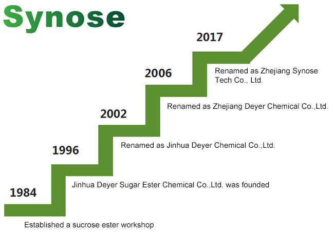 Zhejiang Synose Tech Co., Ltd. is one of the earliest manufacturers of sucrose ester products in China. In 1983, sucrose ester project was established and passed the pilot plant test in 1984. Through more than 30 years' technological innovation, the company has developed into a sucrose ester manufacturer with the largest production scale and the most complete varieties.